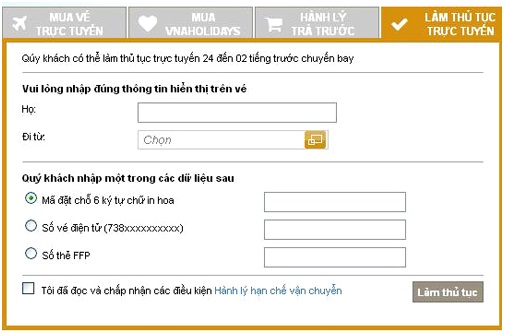 Thủ tục check-in trực tuyến không áp dụng cho các hành khách thuộc trường hợp: Yêu cầu dịch vụ đặc biệt (trừ hành khách yêu cầu dịch vụ suất ăn đặc biệt). Bị từ chối chuyên chở, bị trục xuất. Đi cùng trẻ nhỏ dưới 2 tuổi. Sử dụng vé miễn, giảm cước. Đi trên chuyến bay khởi hành từ các thành phố không thuộc danh mục áp dụng. Đi trên chuyến bay của hãng hàng không khác khai thác. Đi trên chuyến bay hợp tác thương mại giữa Vietnam Airlines và các hãng hàng không khác, trong đó hãng hàng không khác là hãng khai thác chuyến bay.