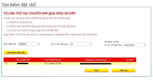 Bước 2: Trang web sẽ tự động đưa bạn tới phần làm thủ tục. Ở đây, bạn điền đầy đủ thông tin gồm mã đặt chỗ, họ tên vào các ô tương ứng. Khi hoàn tất, bạn nhấn tìm kiếm đặt chỗ. |