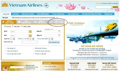 Bước 1: Bạn truy cập vào website: www.vietnamairlines.com, chọn ngôn ngữ tiếng Việt, sau đó, ấn vào tab "Làm thủ tục trực tuyến" tại khu vực đặt vé. |