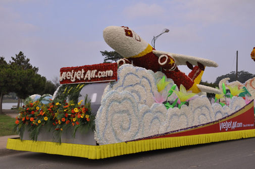 Đó là chiếc tàu bay VietJetAir bằng hoa tươi khổng lồ. Toàn bộ xe hoa đều làm bằng hoa tươi thật mềm mại, duyên dáng và nổi bật hơn hẳn trong đêm hội khai mạc festival hoa. Tàu bay hoa VietJetAir đi dạo khắp các con đường Đà Lạt thật quyến rũ và gần gũi với người dân xứ sở ngàn hoa và du khách.