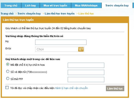 Vào trang web: vietnamairline -> chọn mục Trước chuyến bay -> Chọn mục Làm thủ tục trực tuyến ->Nhập đầy đủ các thông tin