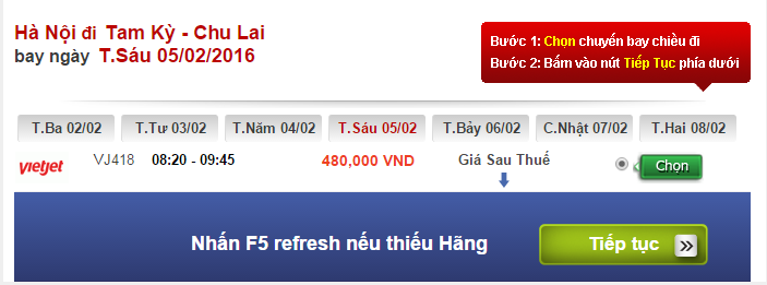 Theo ghi nhận của Vebay247, ở thời điểm hiện tại trên hành trình Hà Nội – Tam Kỳ một số ngày cận Tết hãng hàng không Vietjet dành được sự chú ý đặc biệt với loạt vé máy bay giá chỉ 480.000 đồng trong ngày 05/02 (tức ngày 27 tháng chạp âm lịch), chuyến bay lúc 8h20. Đây cũng là chuyến bay duy nhất còn vé trong ngày này.