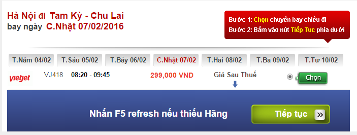 Nếu đặt vé trong ngày 07/02 mức giá vé chỉ dừng ở mức 299.000 đồng, vé giá rẻ bất ngờ được Vietjet đưa ra cho chuyến bay 8h20 ngày 07/02.