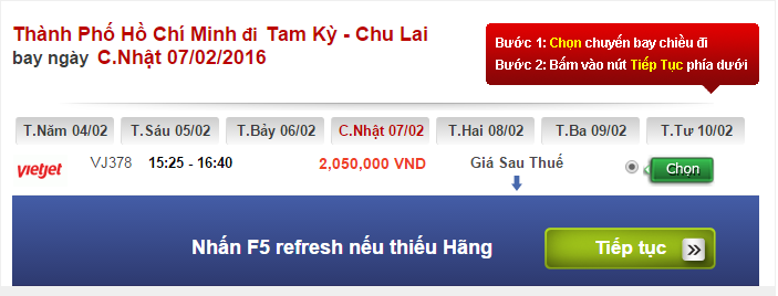 Đối với hành trình Tp Hồ Chí Minh – Tam Kỳ hiện tại giá vé máy bay Tết đang giữ ở mức khá cao. Trong ngày 04/02 giá vé được Vietjet đưa ra là 2.050.000 đồng. Ngày 05 và ngày 06 hiện đã hết vé. Đến ngày 07/02 vẫn còn vé 2.050.000 đồng cho chuyến bay lúc 15h25 của hãng hàng không Vietjet.