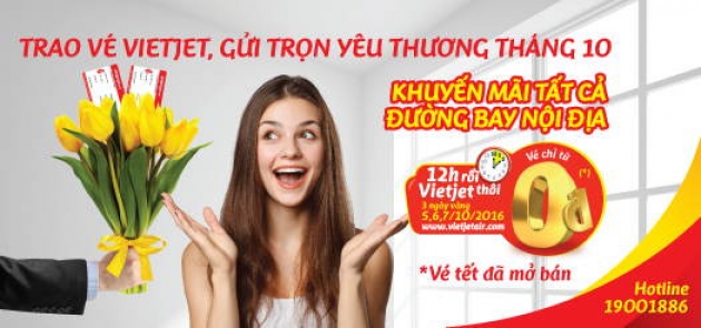 Trao Vé Vietjet, Gửi Trọn Yêu Thương Khuyến mãi tất cả đường bay nội địa. 1. Thời gian khuyến mãi: 12h -14h mỗi ngày – 5,6,7/10/2016